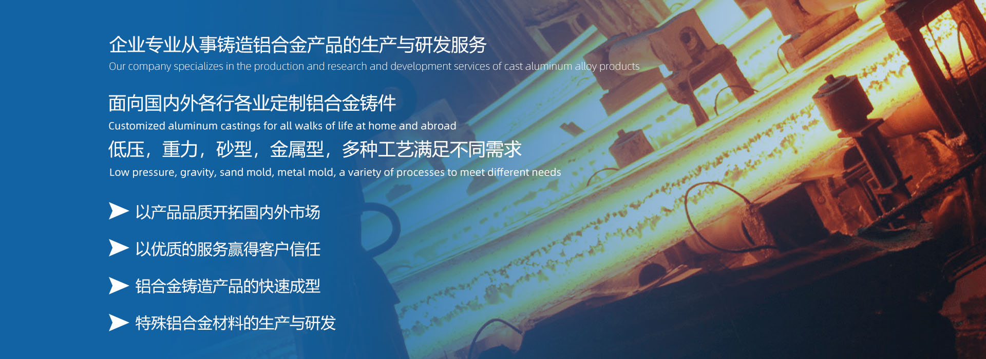本公司致力于引進(jìn)先進(jìn)的鋁合金新材料和鑄造技術(shù)理念及標(biāo)準(zhǔn),專注于鋁合金鑄造產(chǎn)品開發(fā)、生產(chǎn)和服務(wù),緊緊圍繞技術(shù)創(chuàng)新,為客戶提供滿意的技術(shù)服務(wù)及優(yōu)質(zhì)可靠的產(chǎn)品。堅(jiān)持以鋁合金鑄造加工生產(chǎn)和服務(wù)為主體,建立、實(shí)施并持續(xù)改進(jìn)質(zhì)量管理體系,為增強(qiáng)顧客滿意不懈努力。產(chǎn)品廣泛應(yīng)用于特高壓電氣組件、醫(yī)療器械、藥品包裝機(jī)械、汽車零部件、空壓機(jī)部件、高速機(jī)床、能源裝備及軍工部件等領(lǐng)域。
